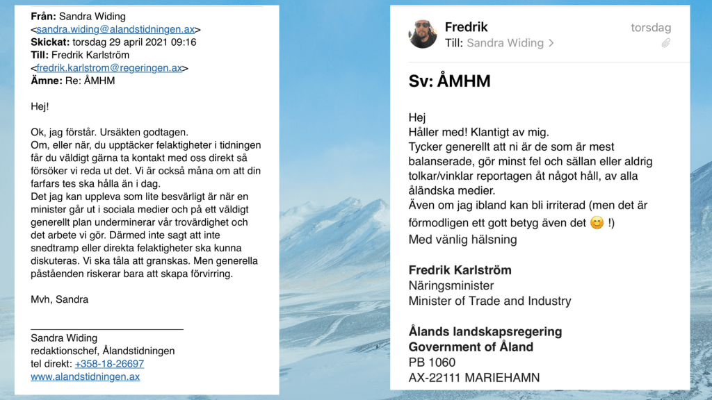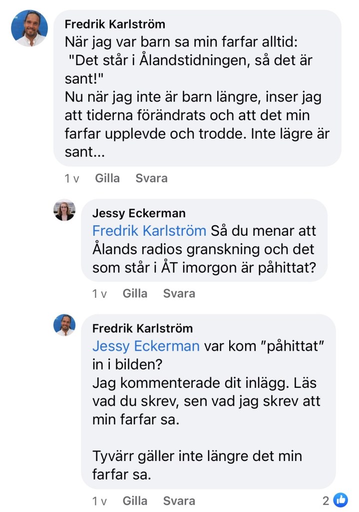Generellt är jag mäkta imponerad över arbetet som utförs i de fyra mediehusen på Åland. Bara att vi har ett sådant stort utbud skall vi vara oerhört stolta, tacksamma och glada över. Det är världsunikt och det utgör även grunden för att demokratin inte är hotat på den här ön. Jag anser även att demokratin eller trovärdigheten hos dessa mediehus, inte heller kan rubbas eller hotas av att en enskild ministers skickar ett kort meddelande på Facebook till en lagtingsledamot. Bägge är starkare än det.