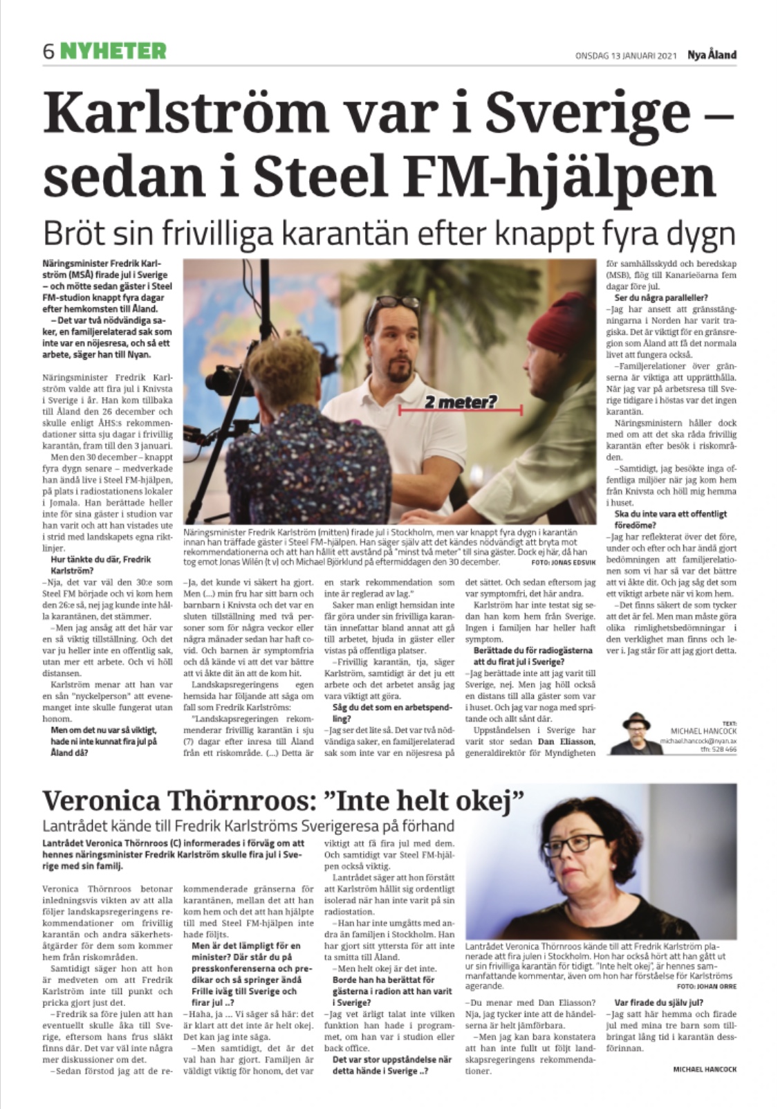 I morgondagens Nya Åland skriver Michael Hancock om att jag firat julafton i Knivsta. Han hade fått ett tips om det och ringde och frågade om jag anser att det är okej för mig att inte respekterat de sju dagarnas frivilliga rekommenderade karantäns bestämmelserna, som landskapsregeringen och jag själv har antagit.